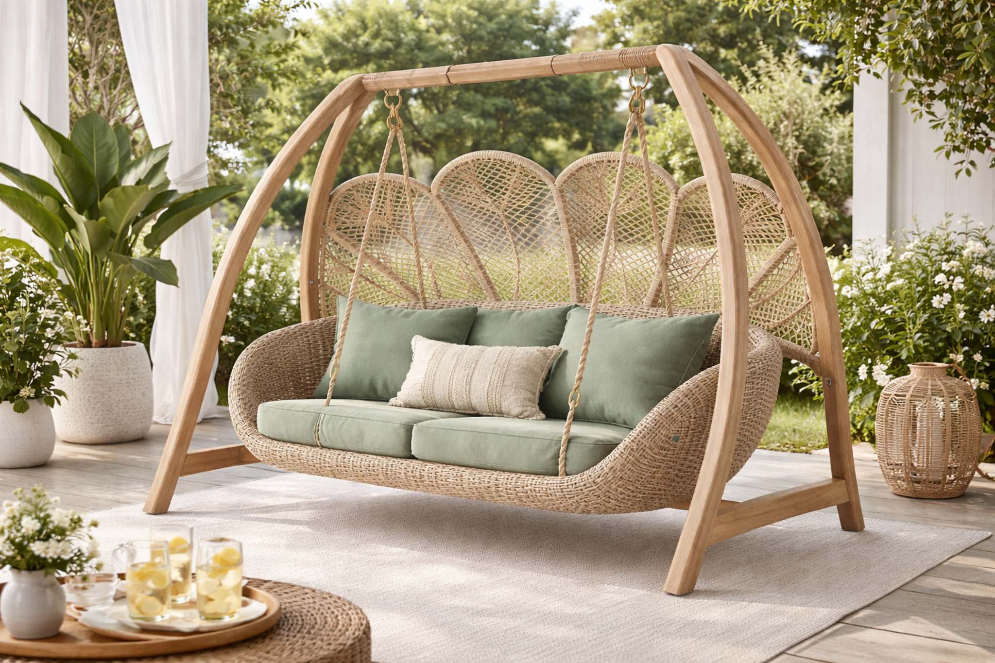 Balancoire suspendue double en bois et corde