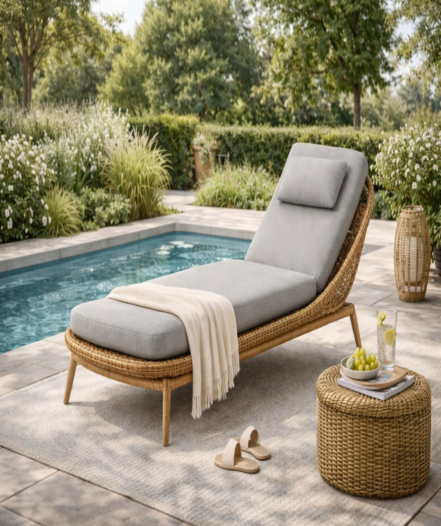 Chaise longue exterieure en rotin avec coussin gris clair